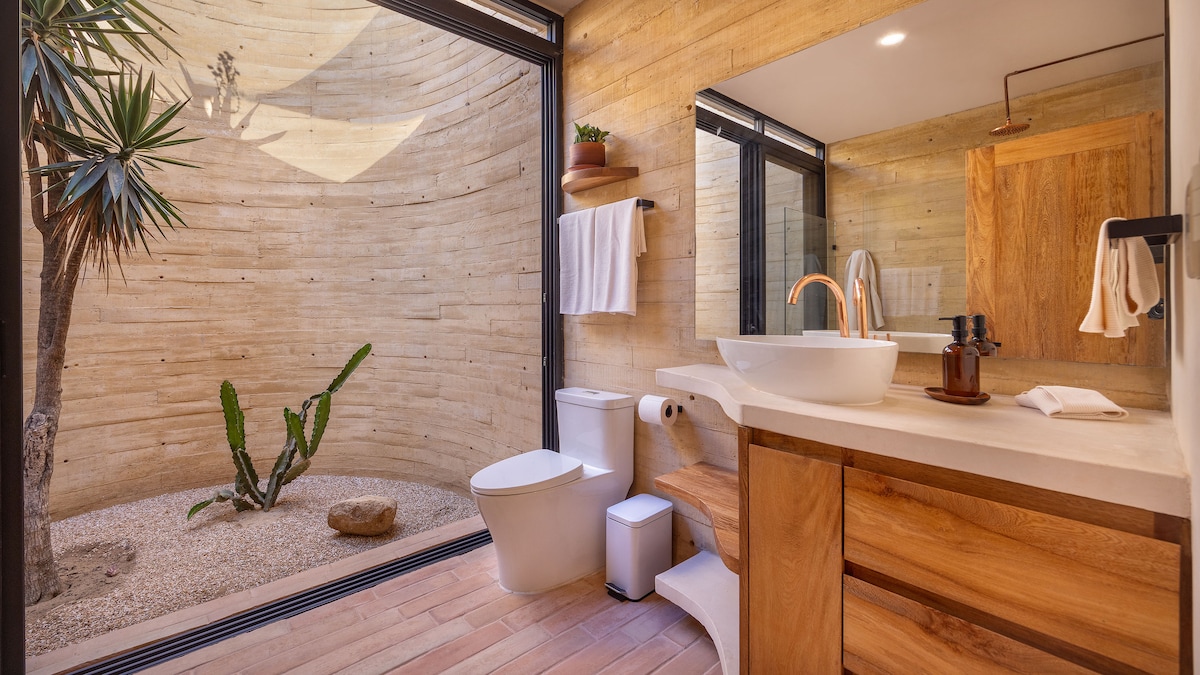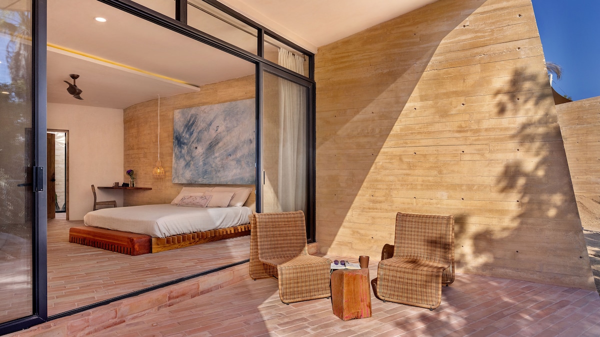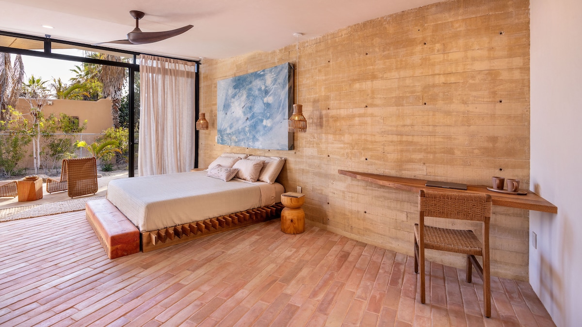 Come to WAMA for an unusual stay. Our unique Baja brutalist architecture and refined interiors invite you to do…and do nothing. This space, Cuarto Serra, is one of our classic king rooms and features original artwork, a designated work area, and a spacious bathroom that opens up into a private courtyard. Outside you’ll enjoy both a secluded ground-floor terrace and an ocean-view rooftop lounge in addition to our gorgeous pool and jacuzzi.