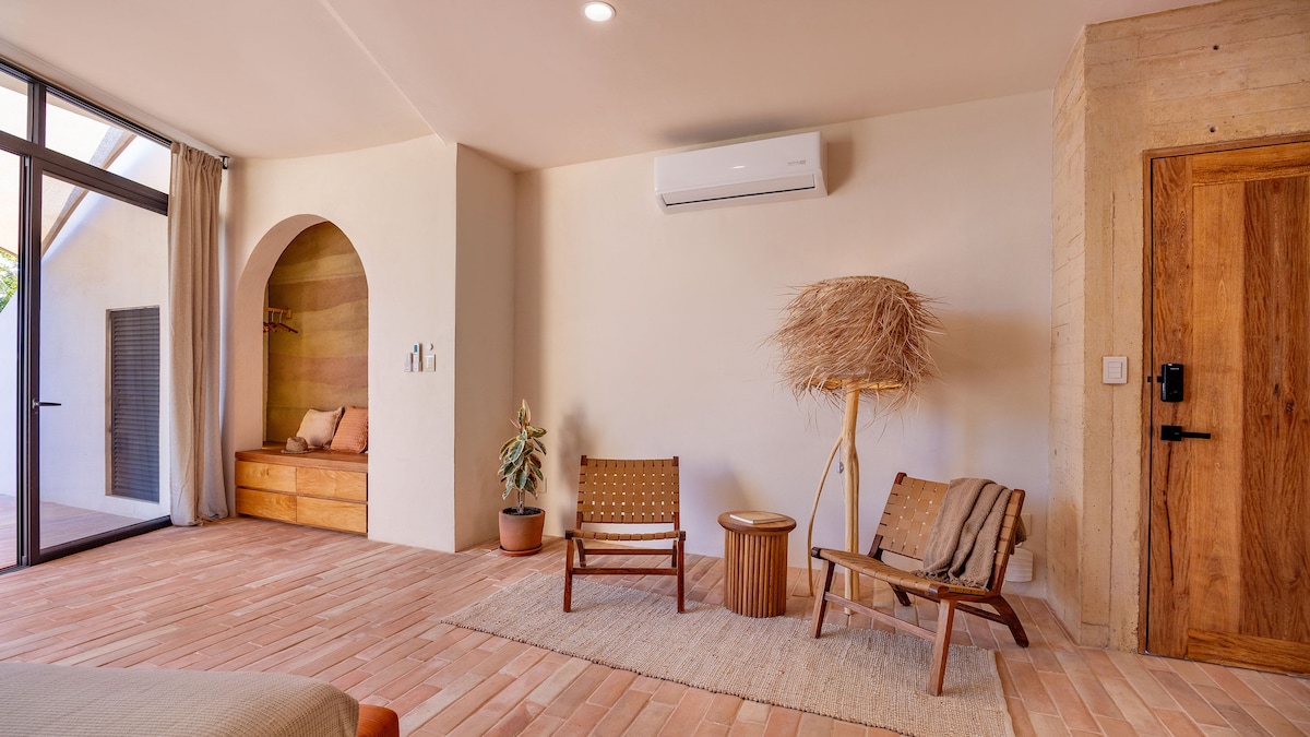 This cuarto includes a variety of spaces for you to enjoy in addition to the interior space. The bathroom opens up into an enclosed mini-courtyard which brings nature inside without compromising your privacy. In front of the room is a large secluded porch area with seating, perfect for reading or enjoying a meal. You'll use a staircase shared with the neighboring room to climb up to the rooftop terrace. The rooftop features a green roof and separate seating areas for the two rooms below. The pool and jacuzzi are shared with all WAMA guests.